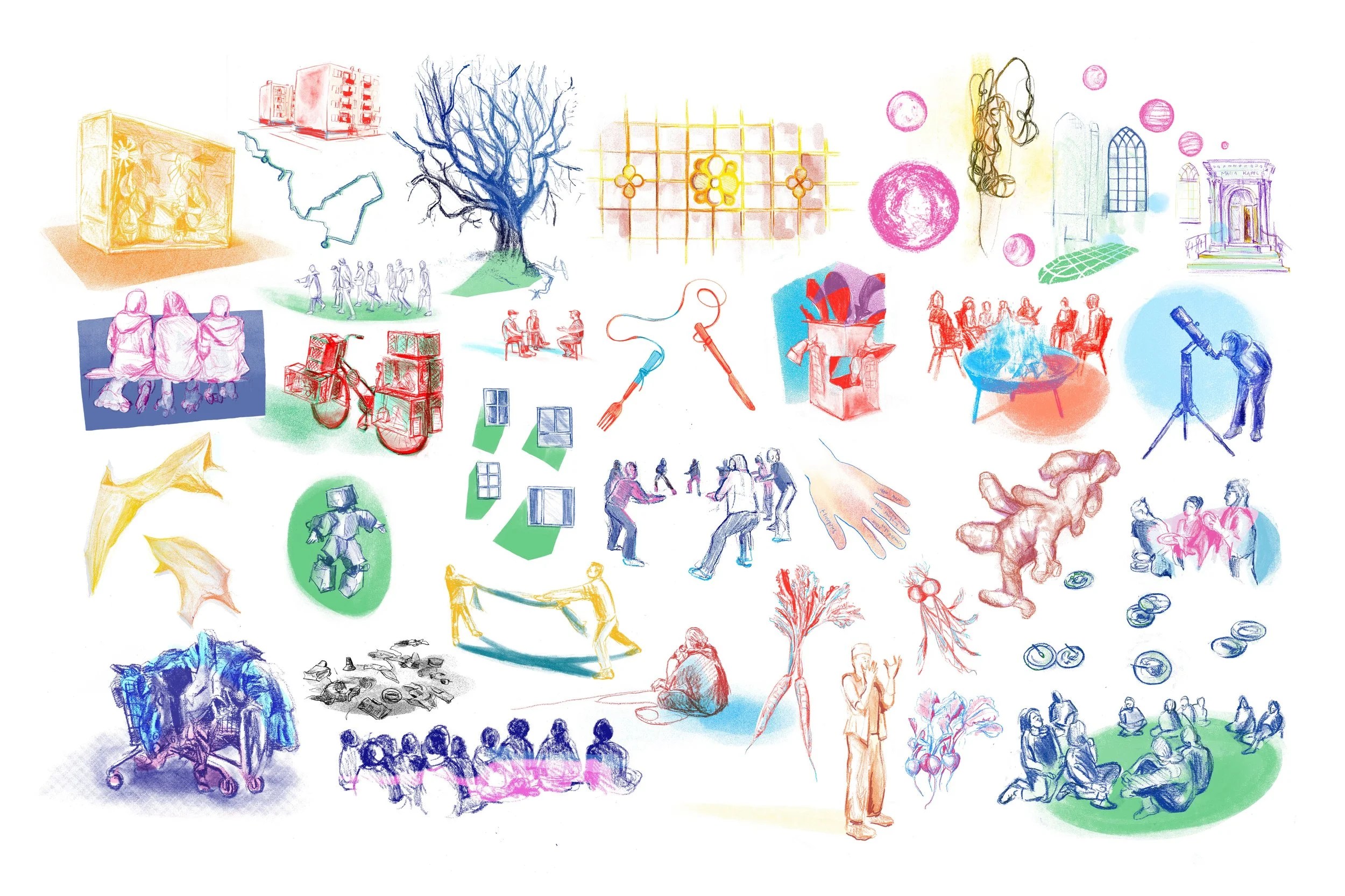 Dit is een onderzoek in opdracht van het VriendenLoterij Fonds om de kennis van sociale kunstpraktijken te vergroten. Voor de uitvoering hiervan wordt de samenwerking gezocht met onderzoekers die de impact op een andere manier kunnen bevragen en in beeld brengen. Dit maal is het onderzoek uitgevoerd door kunstenaar-antropoloog Kyra Sacks, waarvoor zij vijf van de creatieve partners die ondersteuning ontvangen van het VriendenLoterij Fonds door een artistieke en antropologische lens heeft uitgelicht. Het doel is om de uitdagingen van het maakproces van sociale kunstpraktijken beter te begrijpen, zodat het VriendenLoterij Fonds de partners daarin zo goed mogelijk kan blijven ondersteunen. Dit onderzoek geeft inzichten die voor zowel het VriendenLoterij Fonds, hun partners en toekomstige creatieve samenwerkingen tussen kunstenaars en gemeenschappen behulpzaam zijn. Het VriendenLoterij Fonds ondersteunt kunst- en cultuurprojecten die radicale verbeelding inzetten om te laten zien dat een andere wereld mogelijk is. Eén waarin ruimte is voor een veelheid aan perspectieven, waarin op een gelijkwaardige en inclusieve manier wordt samengewerkt, en onbetwiste, dominante waarheden worden bevraagd. Sociale kunstprojecten nemen fluïde en onvoorspelbare vormen aan, en ruimte voor ‘frictie en falen’, voor onzekerheid en het nog-niet-weten, voor liminaliteit is een belangrijk onderdeel van het maakproces. Via de tekeningen en verhalen in dit landschap kruipen we dieper in het weefsel van sociale kunst en de veelzijdige uitingen en uitdagingen die daar onderdeel van zijn.